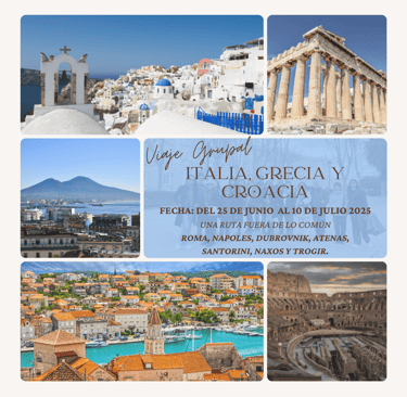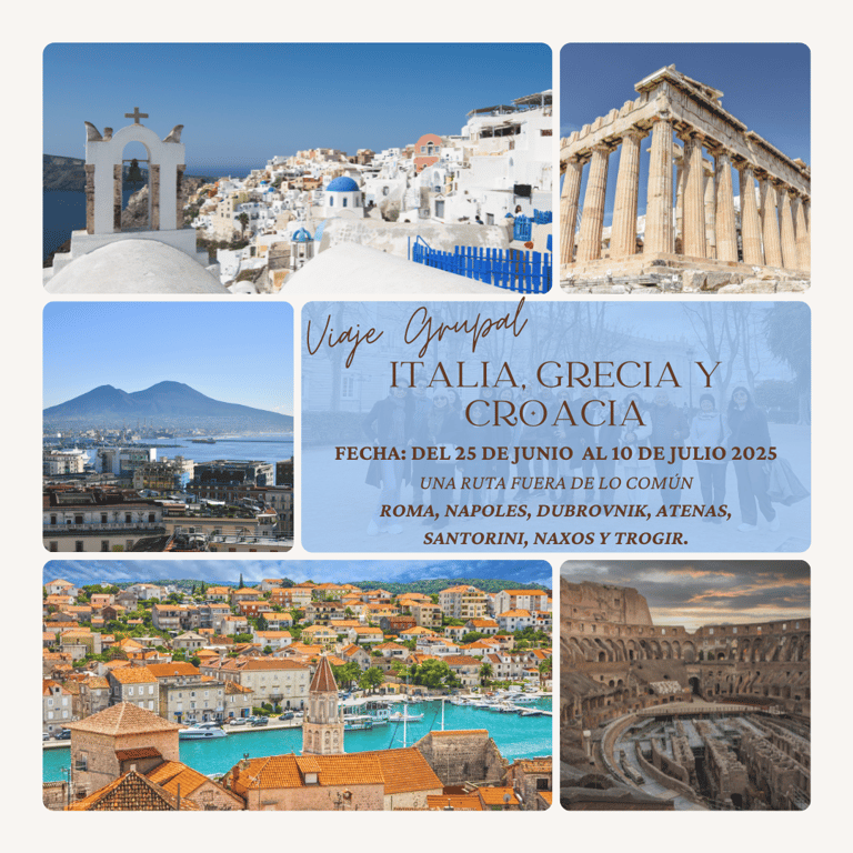 Imagina un verano inolvidable recorriendo algunas de las ciudades más fascinantes del Mediterráneo y Europa, donde historia, cultura y paisajes impresionantes se combinan en una aventura única. Del 25 de junio al 10 de julio, te invitamos a un viaje exclusivo de 15 noches y 16 días, que te llevará a descubrir Roma, Nápoles y la Costa Amalfitana, Santorini, Naxos, Atenas, Dubrovnik y Trogir con Split en Croacia. Un recorrido pensado para un pequeño grupo de viajeros que buscan algo diferente, con atención personalizada y una experiencia sin igual.